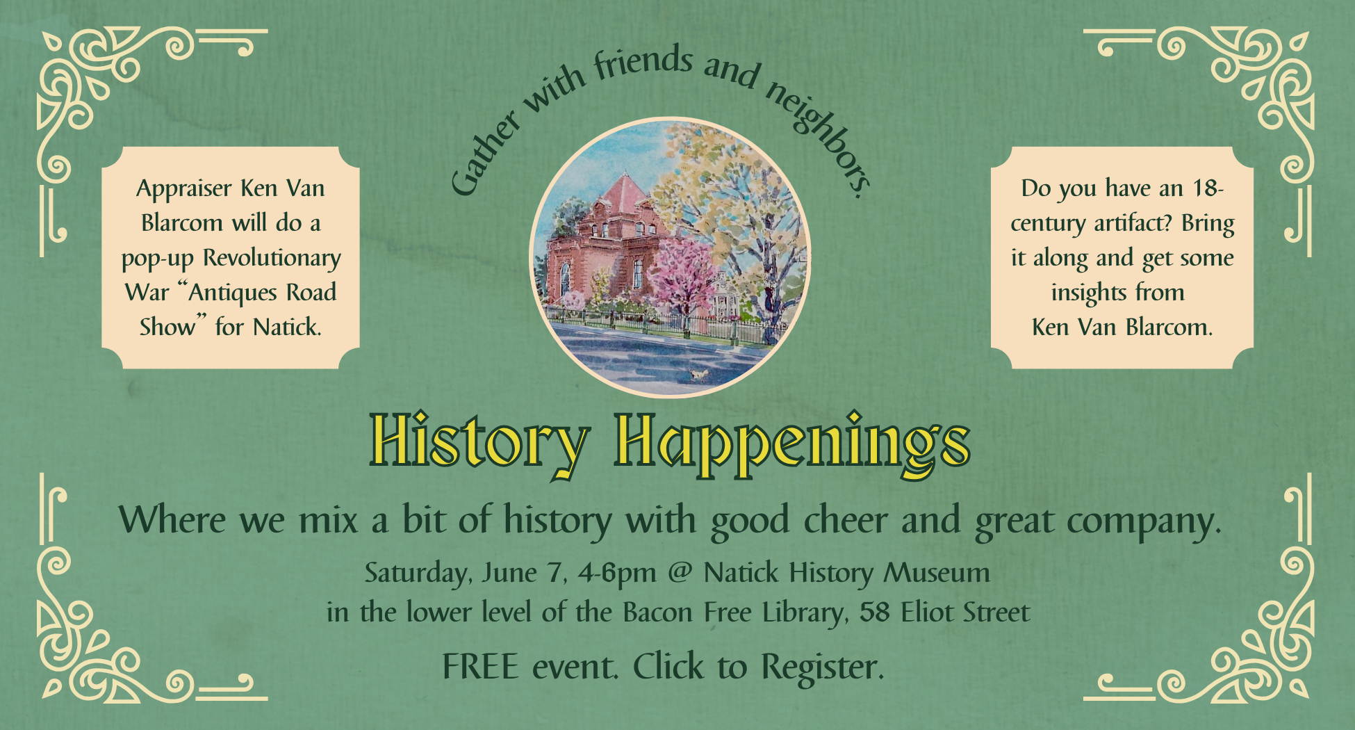 Light refreshments served. Enjoy the exhibits and chat with neighbors and the staff and volunteers of the Natick Historical Society.
