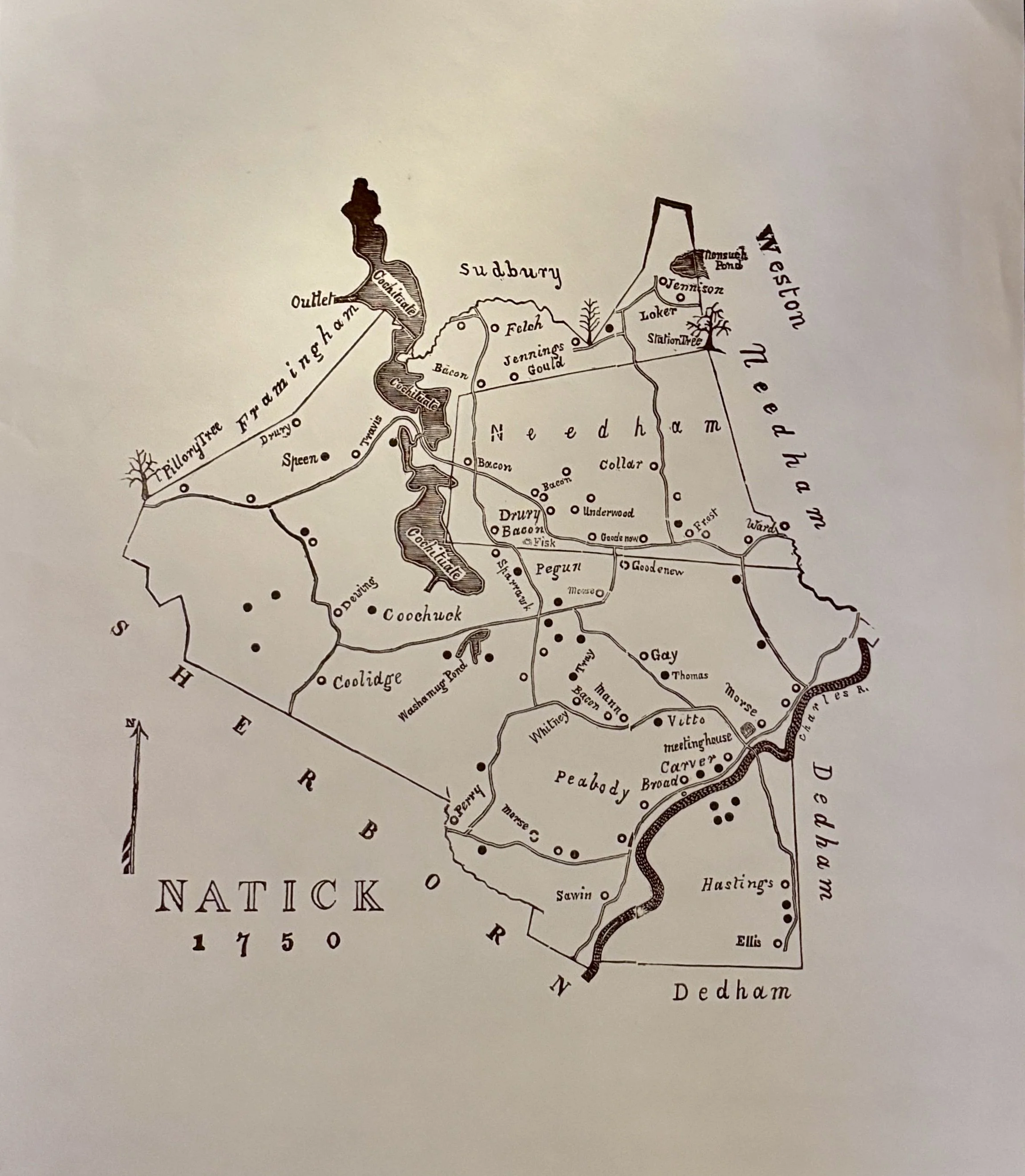 A survey of Natick in 1750 featuring English and Indigenous homes. Samuel Livermore conducted the survey.